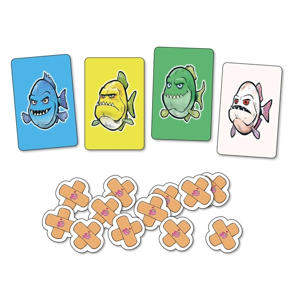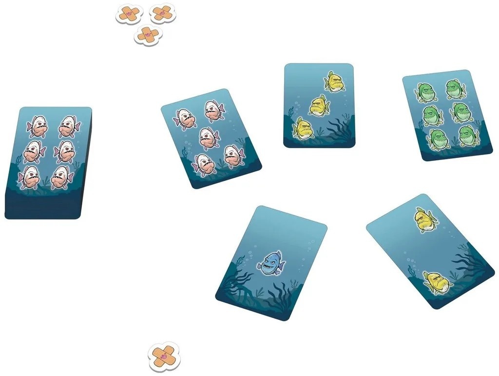 Žravé rybky jsou karetní hra s piraněmi pro malé i velké hráče! Hráč ve svém tahu položí oboustrannou kartu jednou ze dvou stran nahoru a poté otočí všechny karty stejné barvy na druhou stranu. Jde o to, aby se v ten okamžik neobjevilo deset a více piraň jedné barvy, protože pokud ano, tak hráče kousnou a přijde o své životy. Žravé rybky jsou jednoduchá hra, která ale řádně prověří vaši paměť!