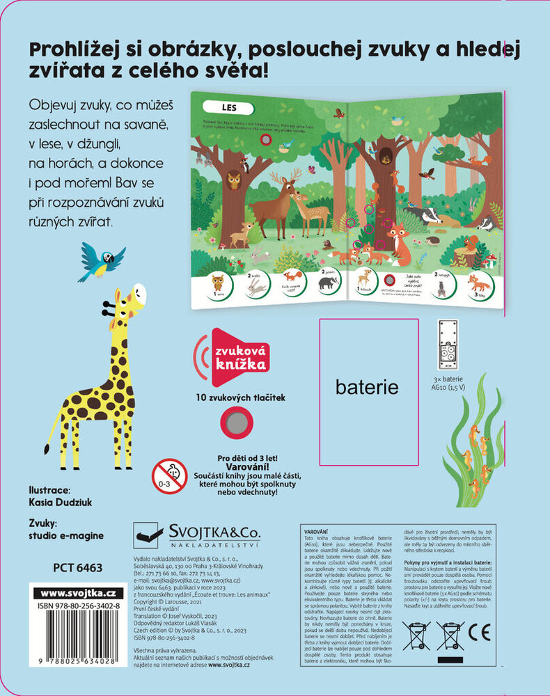 Hledej a poznávej s touto zvukovou knihou zvířata z celého světa! V různých prostředích, od savany přes moře až po hory, se seznámíš s jejich obyvateli a dozvíš se i zajímavé informace. Na každé straně této krásně ilustrované knížky poslouchej nejrůznější zvuky a poznej, která zvířata je vydávají. ...