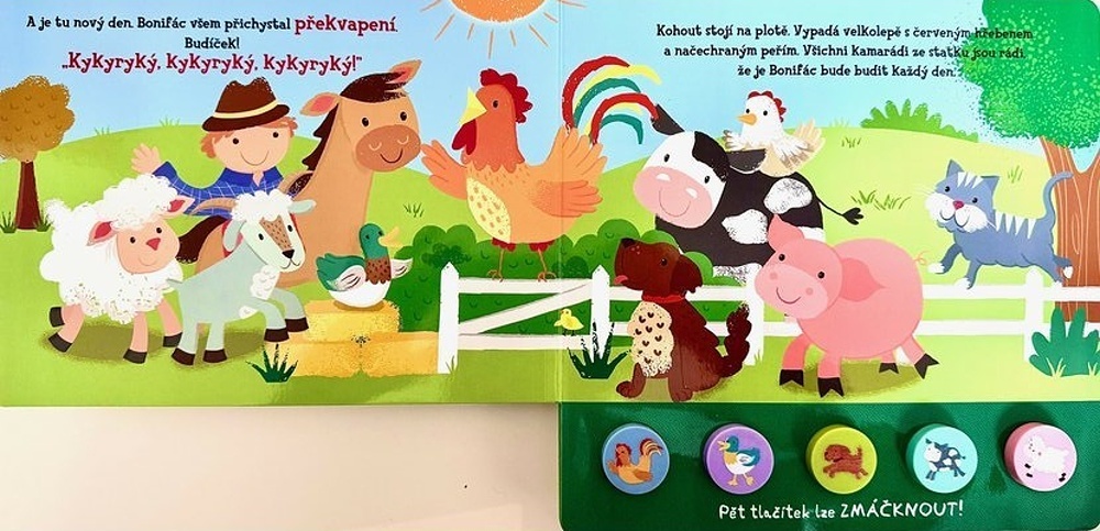 Seznamte se s kohoutem Bonifácem, koníkem Vilíkem, kačenkou Karličkou, prasátkem Pepou, pejskem Bojarem a spoustou dalších milých zvířátek. Knížka obsahuje pět měkkých zvukových tlačítek, která jsou ideální i pro ty nejmenší ručičky. Díky nim si děti mohou poslechnout skutečné zvuky zvířátek a naučit se je poznávat a pojmenovávat. Úžasné ilustrace oživují příběh a podněcují dětskou fantazii.
